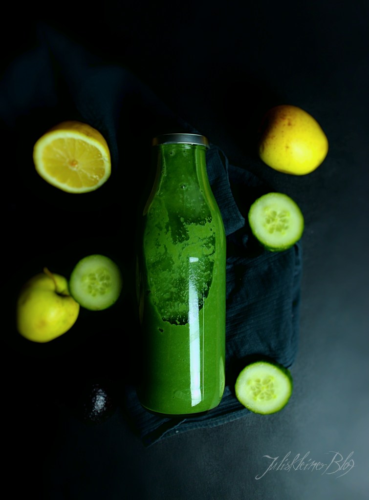 Die Kerne der Äpfel und Avocados entfernen, Ingwer schälen und alles in kleine Stücke schneiden. Zitrone auspressen und mit den restlichen Zutaten in einen Mixer geben. Alles pürieren.