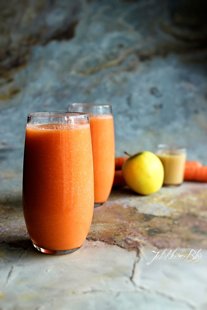 Die Kerne und Stängel des Apfels und der Birne entfernen und die Karotten schälen. Alles in kleine Stücke schneiden und alles in einem Mixer pürieren.