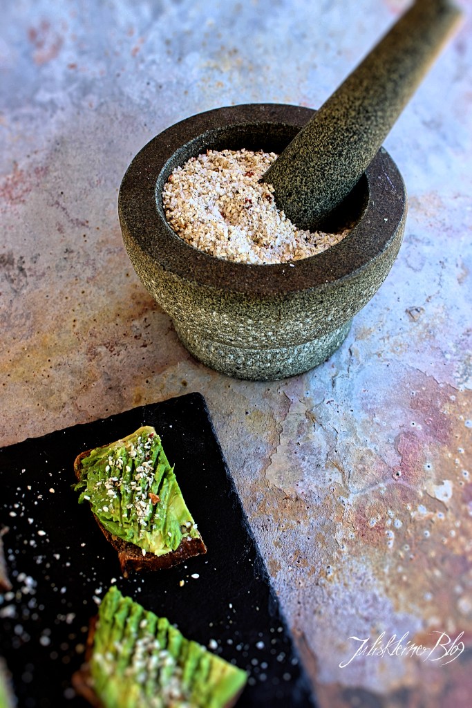 Den Sesam in einer Pfanne ohne Öl leicht anrösten. Chili und Pfeffer in einem Mörser zerstoßen, den Sesam dazugeben und grob zerstoßen.