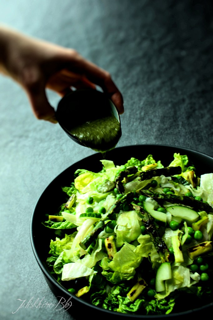 Den gegrillten Spargel schneiden und unter das restliche Gemüse mischen. Das Dressing untermengen.