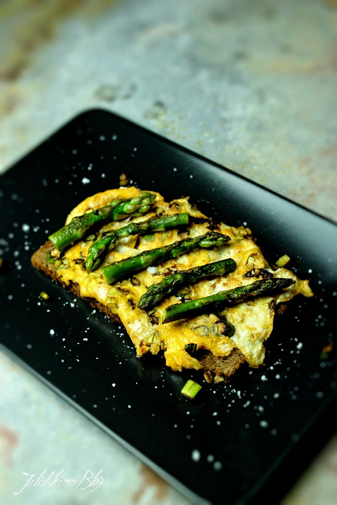 In einer Pfanne die Butter erhitzen und den Spargel, inklusiven den Spargelspitzen darin anbraten. Dann die Spargelspitzen herausnehmen und das Ei über die Spargelstücke gießen und garen.