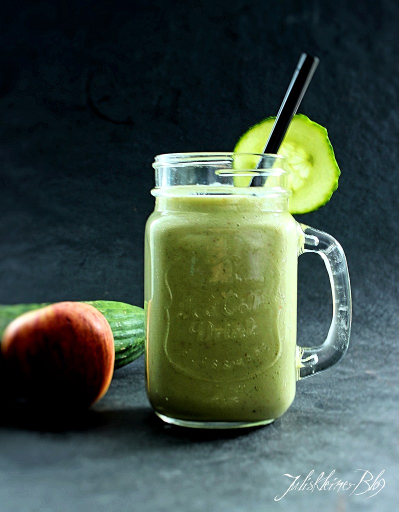 Apfel und Gurke waschen und das Kerngehäuse des Apfels entfernen. Gurke und Apfel in kleine Stücke schneiden und mit den restlichen Zutaten in einen Mixer geben. Alles mixen.