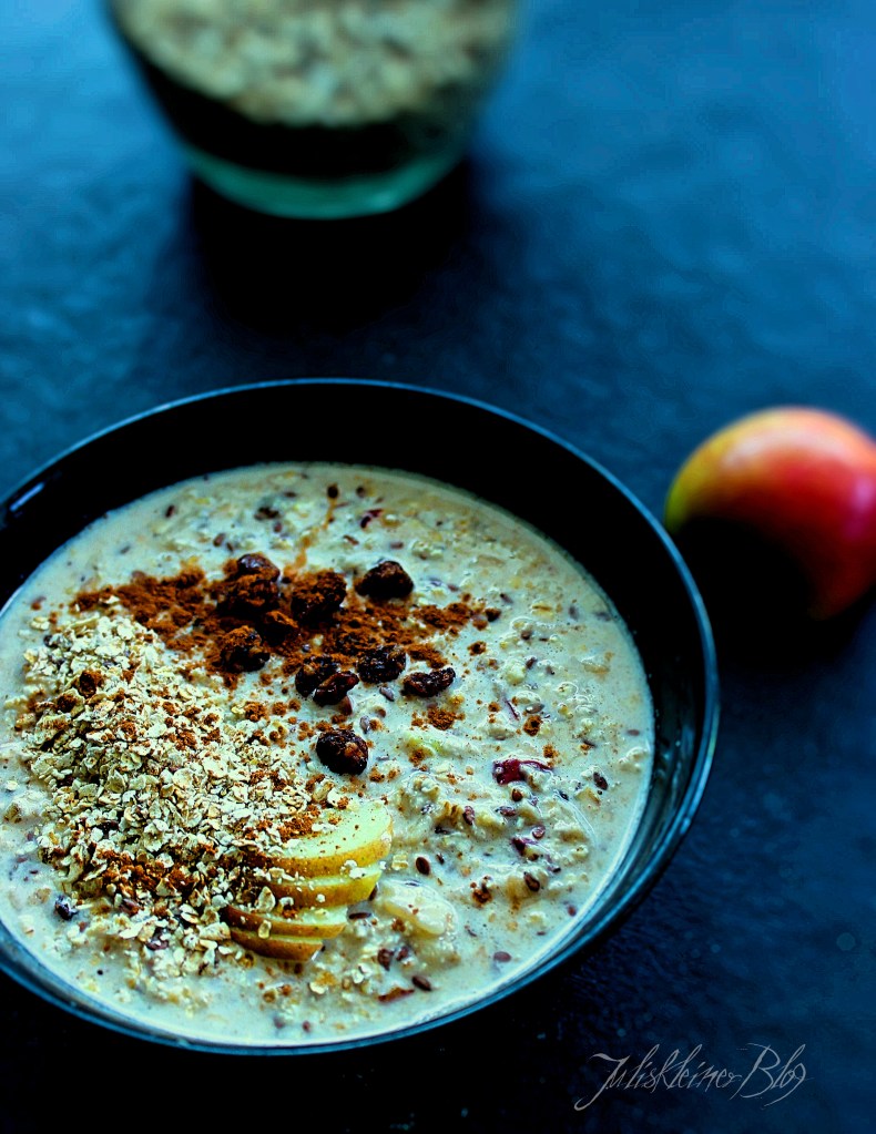 Apfel fein reiben und für 30 Sekunden in die Mikrowelle geben. Dann alle restlichen Zutaten dazugeben und gut vermischen.