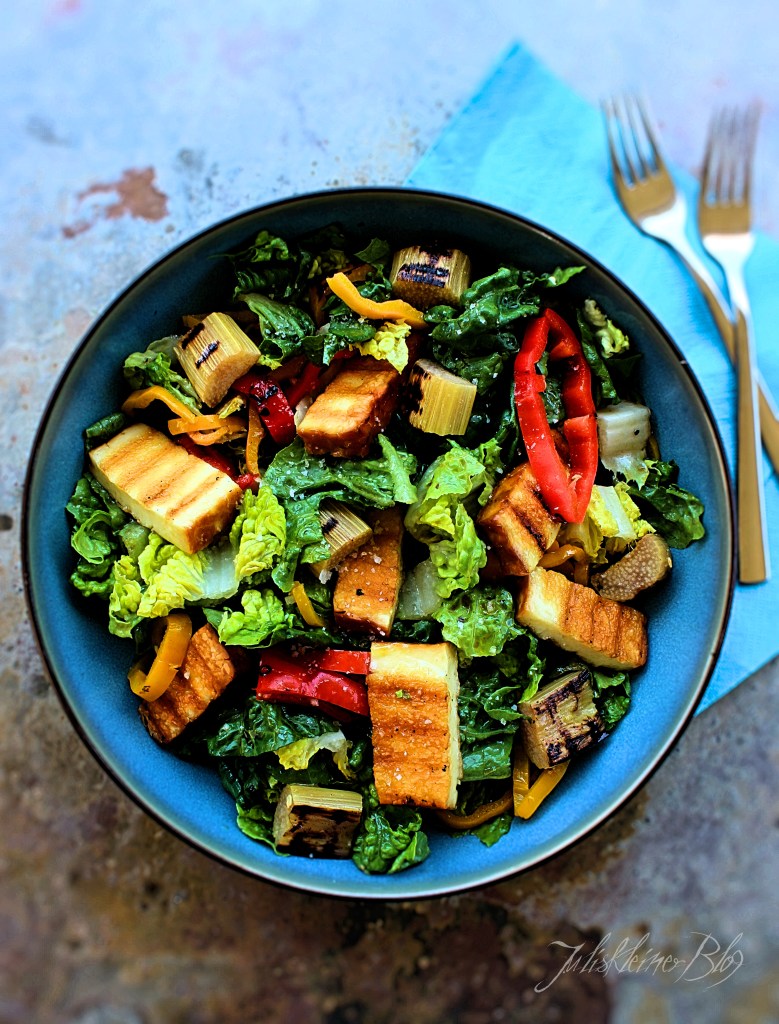 Paprika, Grillkäse und Rhabarber auf dem Grill oder in einer Grillpfanne grillen. Paprika und Käse dann in mundgerechte Stücke schneiden und alles mit dem Salat vermischen. Mit Olivenöl und Balsamico abmachen und mit Salz abschmecken.