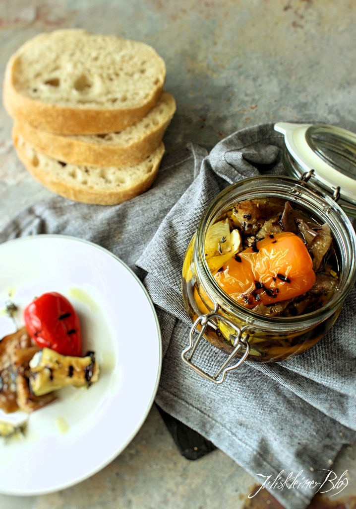 Ca. 2 Wochen im Kühlschrank ziehen lassen. Das Gemüse schmeckt herrlich zu gegrilltem Fleisch und Fisch oder einfach auf Brot. Das Öl kann man für Salate weiterverwenden, da es den Geschmack des Gemüses angenommen hat.