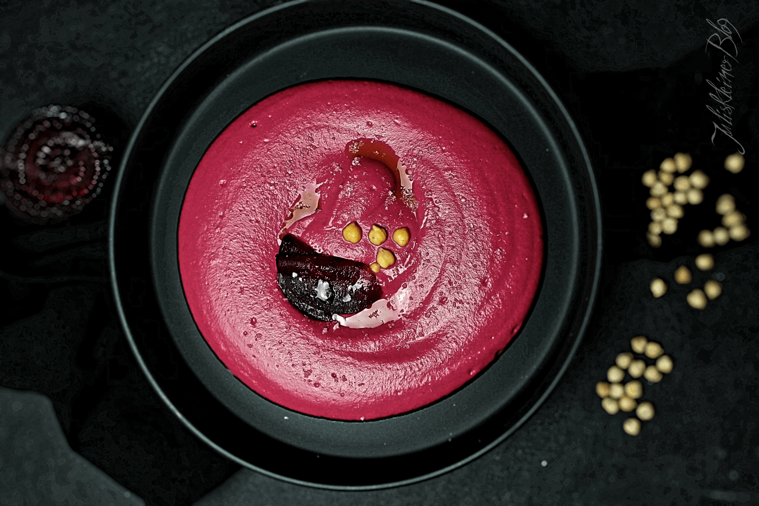 Rote Beete schälen und in grobe Stücke schneiden. Den Knoblauch ebenfalls schälen. Alle Zutaten, bis auf das Wasser in einen Mixer geben. Das Wasser nach und nach dazugeben bis das Hummus die gewünschte Konsistenz hat.