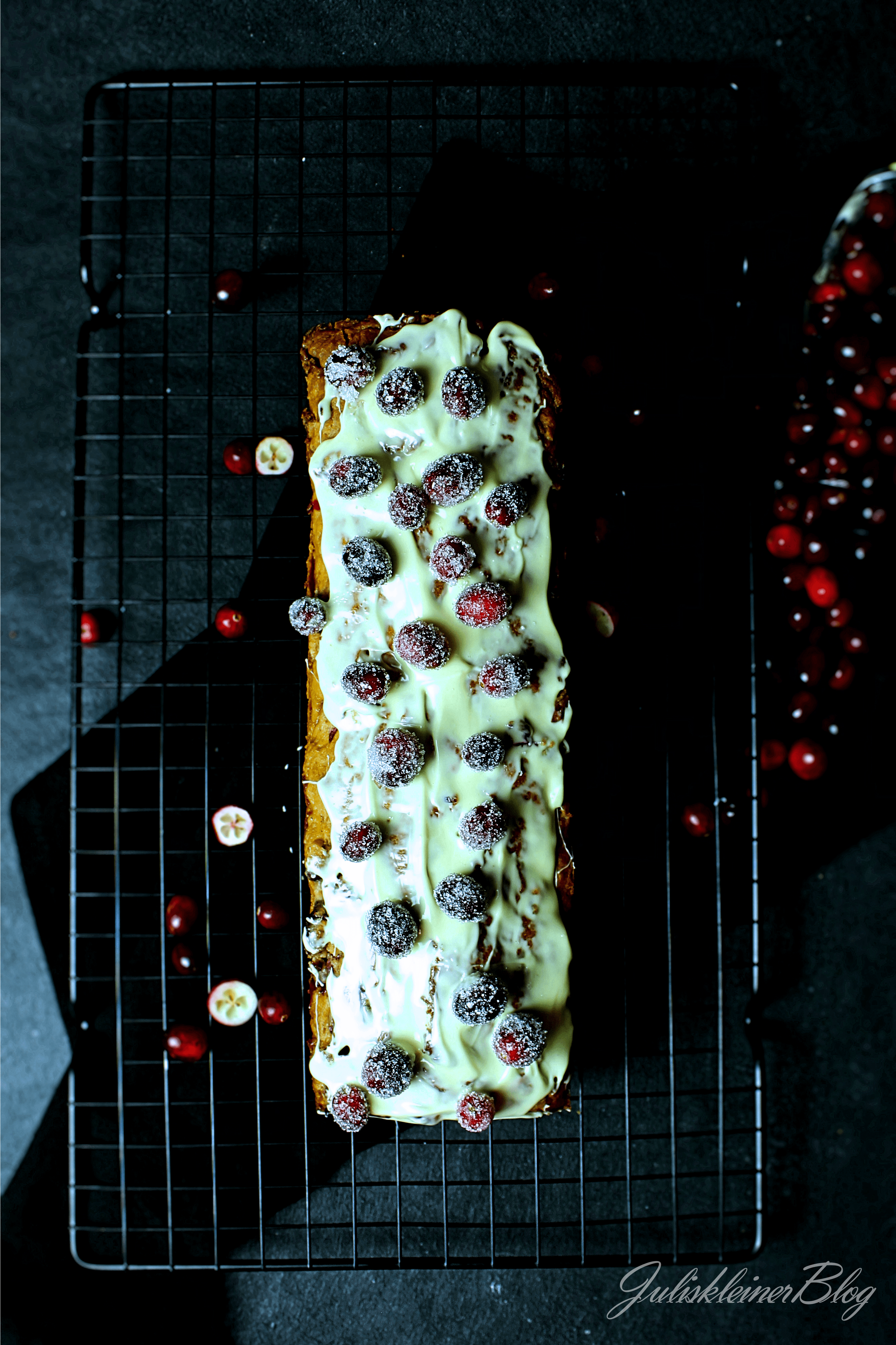 In der Zwischenzeit die Schokolade mit dem Öl vermischen und schmelzen lassen. Dann auf dem ausgekühlten Kuchen verteilen. Mit den gezuckerten Cranberries garnieren.